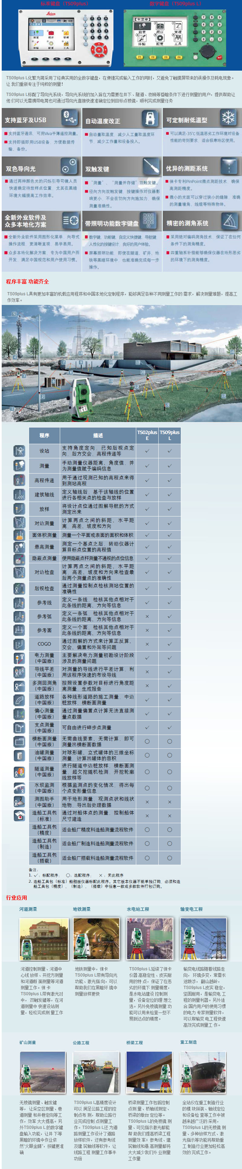徕卡测量系统TS09plus L是一款集瑞士光学与机械制造极致技术工艺和中国测绘工作需求的一款全新产品。TS09plus L采用了更加简约实用的数字键盘并标配导向光功能它将会是中国测量工程师们最得心应手的一款仪器