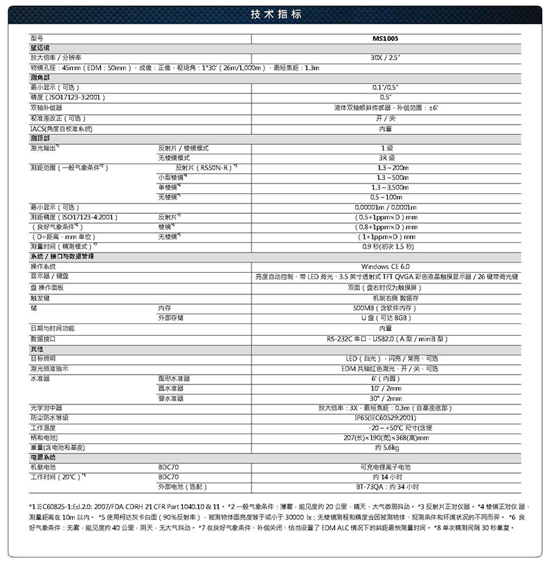 MS1005采用了拓普康尖端的两大独创技术:IACS测角技术、RED-tech EX测距技术,并且具备两大特点:高精度、高性价比。高精度无疑是代表着MS系列全站仪突出的优点所在,0.5″的测角精度以及0.5mm的测距精度更是完美地符合了新出台的“测绘资质分级标准”中的要求;高性价比是它在同类全站仪中脱颖而出的必备条件。